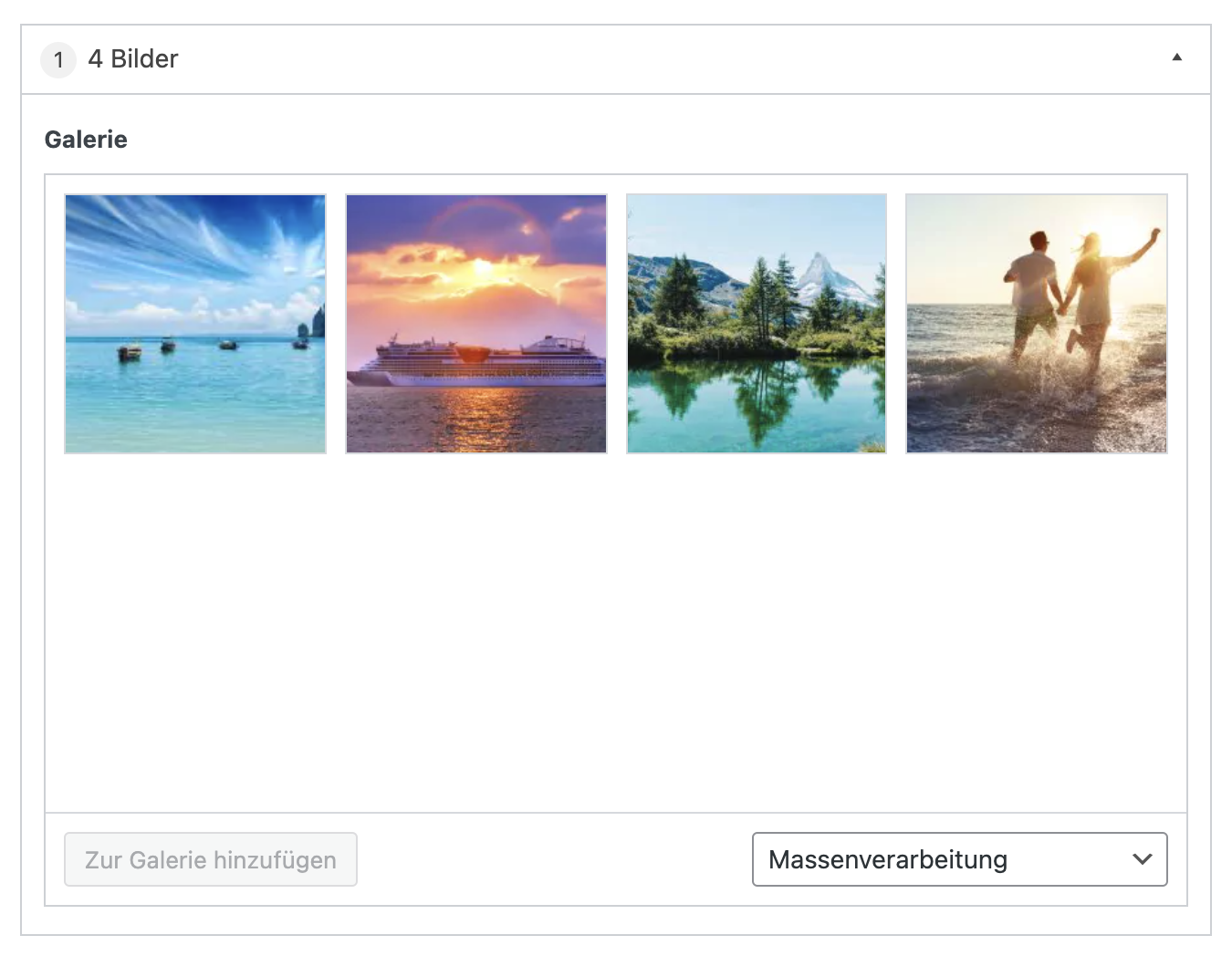 Sie können 4 Bilder definieren, welche im Formular „Reisegutschein“ auf ihrer Website angezeigt werden. Sollten Sie das Formular nicht verwenden, können Sie diese Seite überspringen.