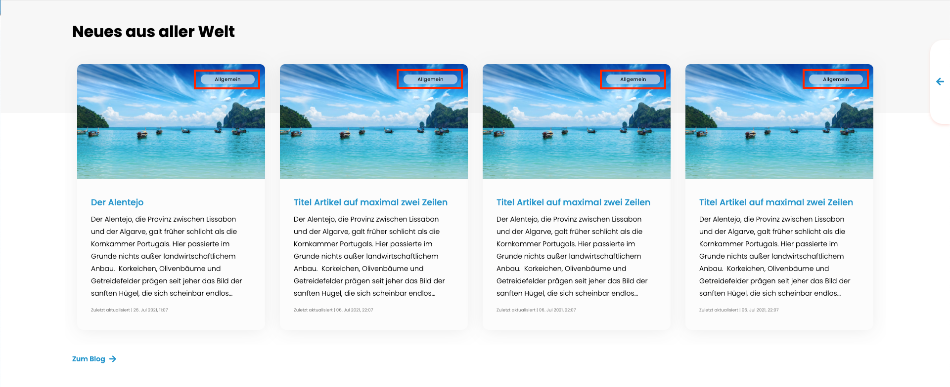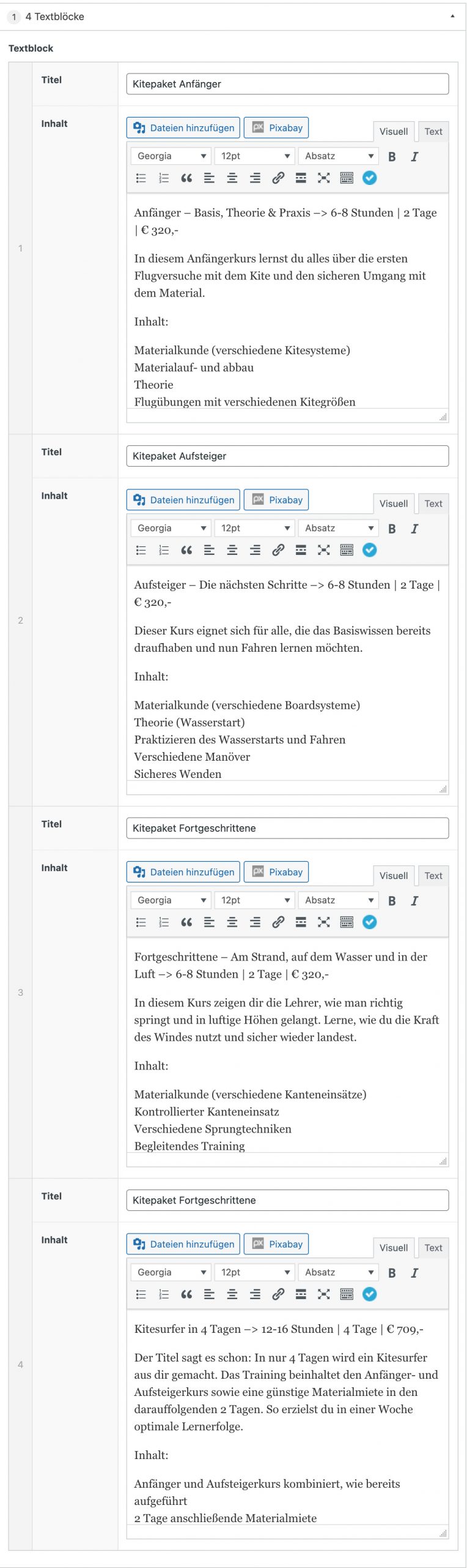 Bei diesem Modul können 4 Titel mit zugehörigem Text eingegeben werden, welche in Form von Cards auf der Website angezeigt werden.