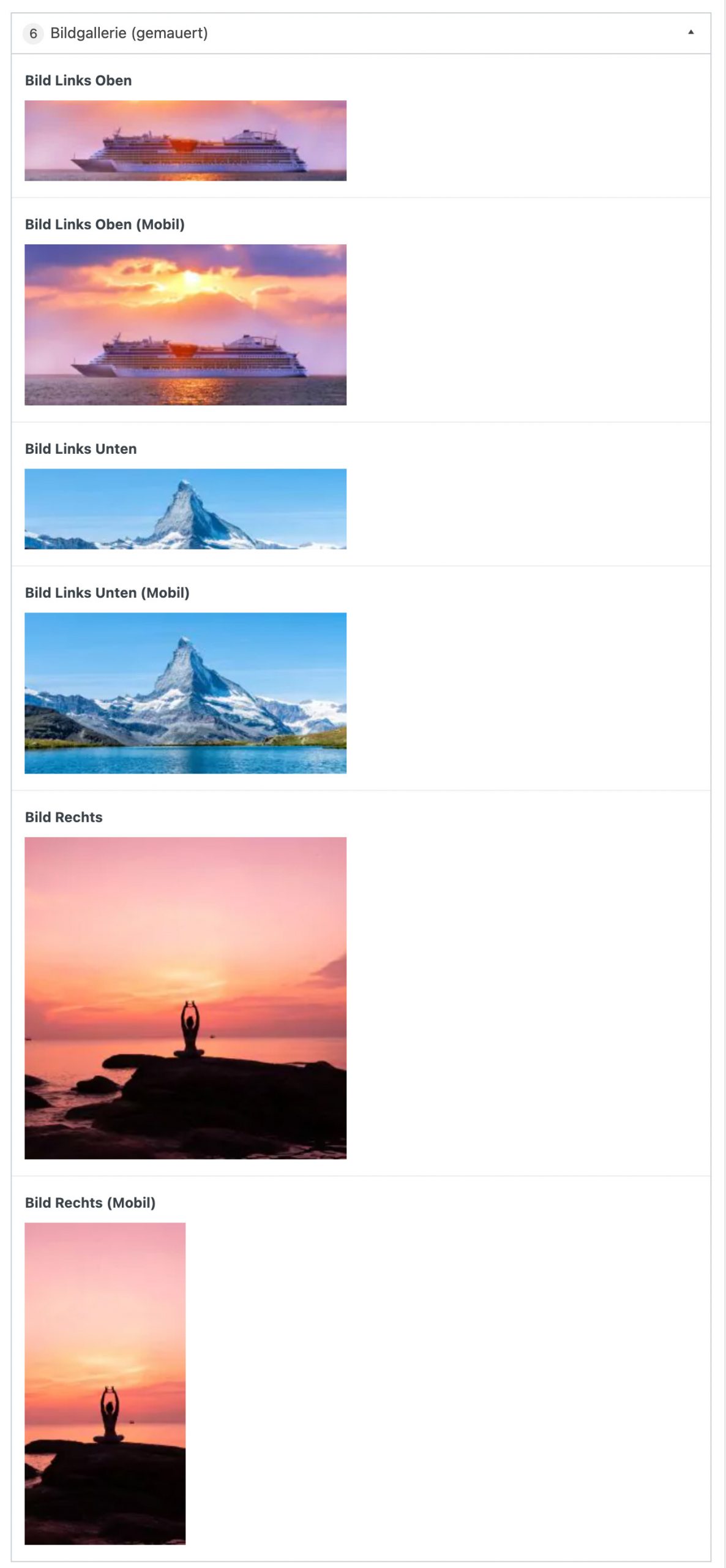 Bei diesem Modul können 3 Bilder festgelegt werden (je für Desktop und Mobil), welche als Bildergalerie angezeigt werden.