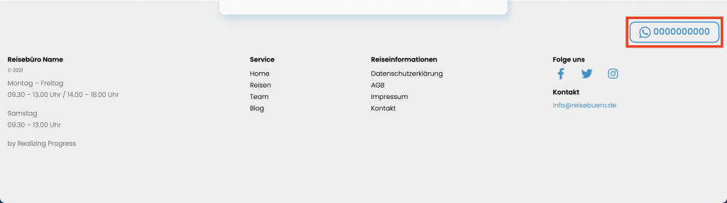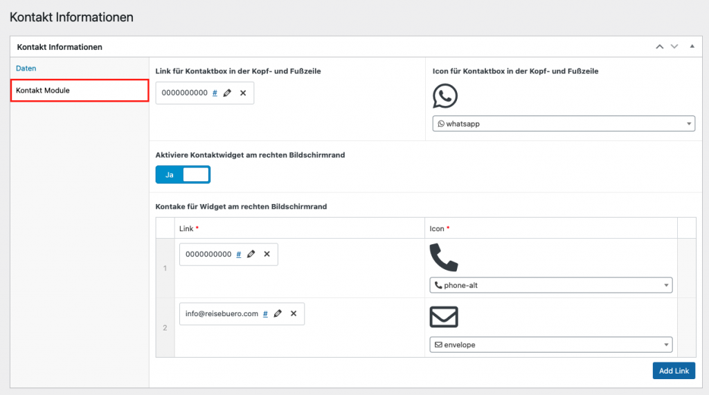 In der Sektion „Kontakt Module“ können sie den Link definieren, der in der Kopf- und Fußzeile Ihrer Webseite angezeigt wird (z.B. Whatsapp, Mail, Nachricht oder Telefon).