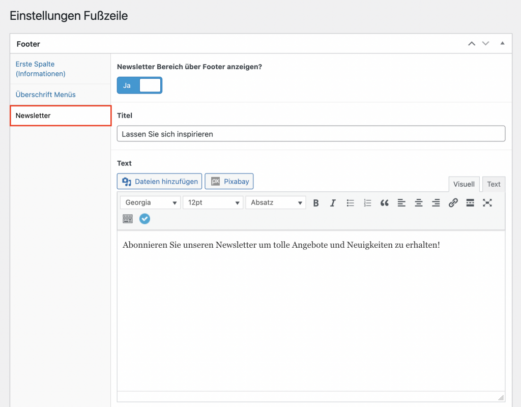 In der Sektion „Newsletter“ können Sie das Newsletter-Element aktivieren oder deaktivieren. Zudem ist es hier möglich einen Titel und Text festzulegen.