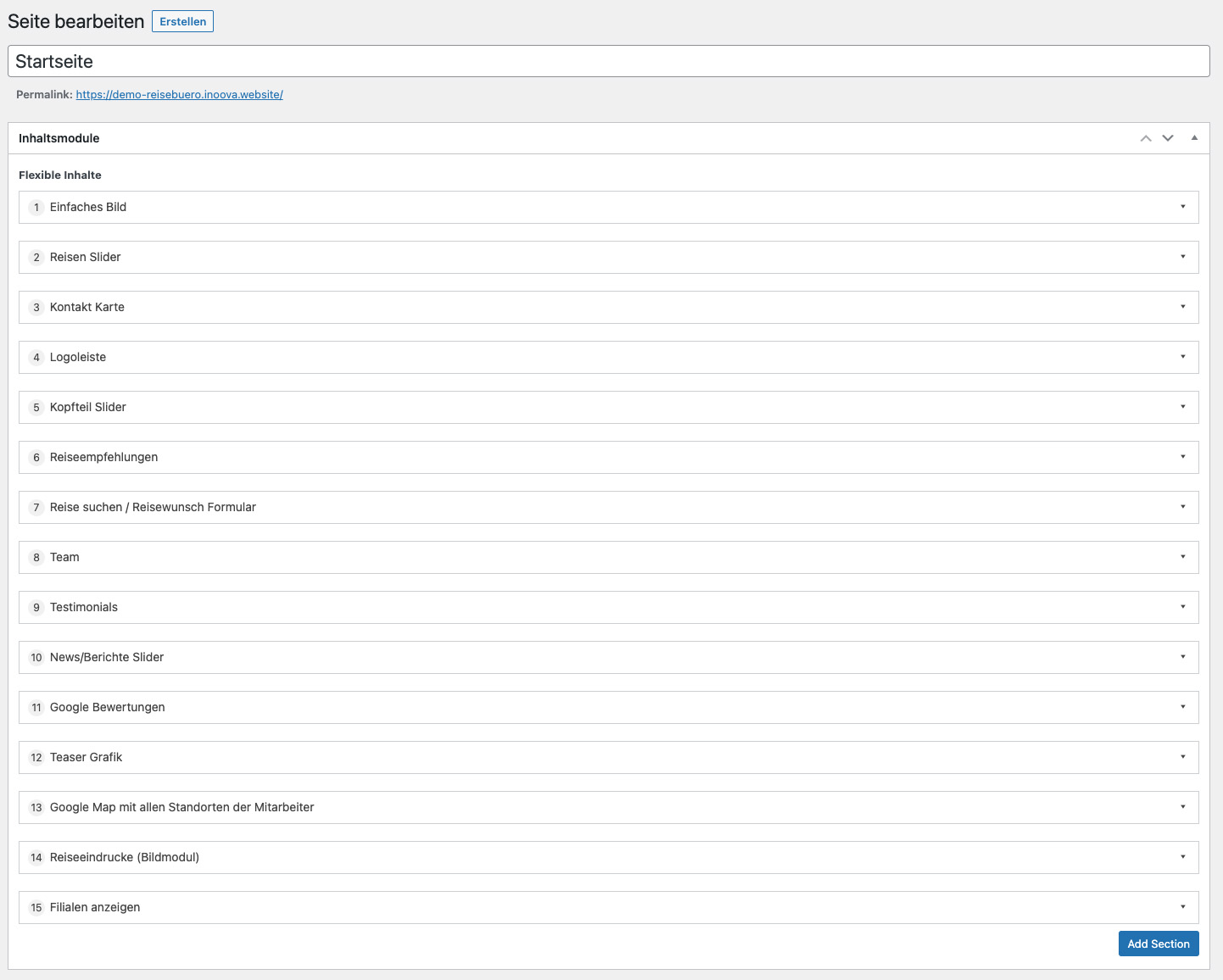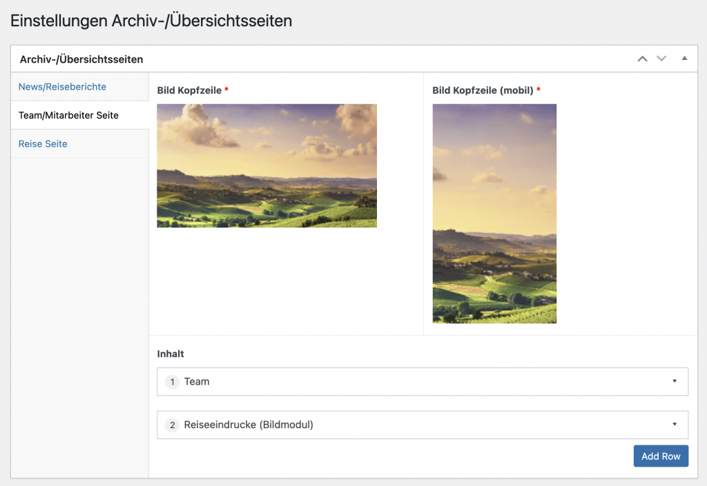 Für jedes einzelne Gebiet kann ein Teaser Bild festgelegt werden, sowie Flexible Inhalte für die jeweilige Gebietsseite. Der Inhalt der Seite kann durch flexible Module individuell zusammengestellt werden. Durch die Aktion „Add Row“ können wir gehabt neue Inhaltsmodule eingefügt werden.