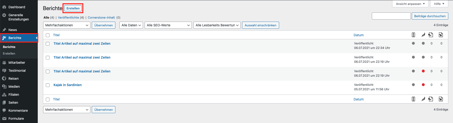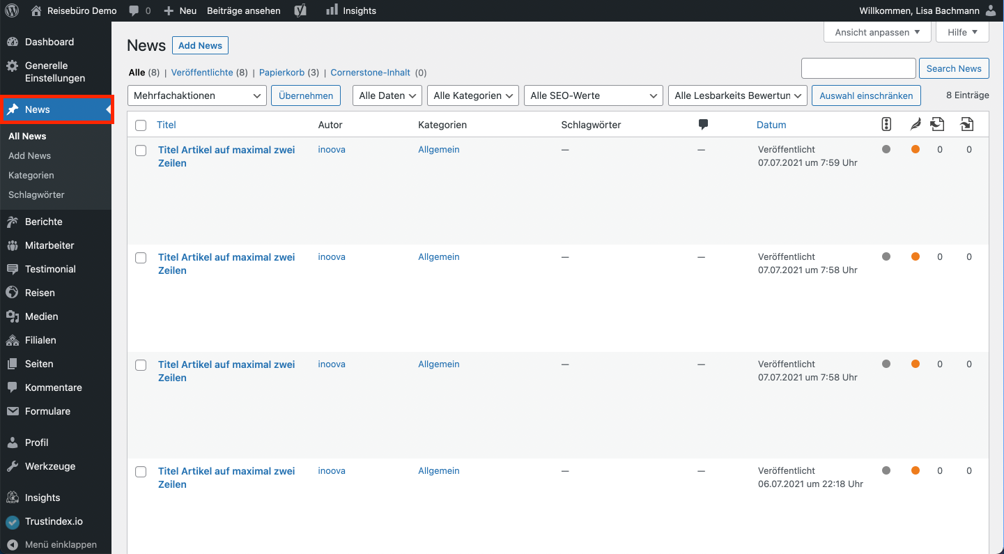 In der Sektion können Sie die Seite bearbeiten, auf welcher die News und Beiträge angezeigt werden. Es handelt sich also um die Übersichtsseite oder Blog-Seite. Es wird ein Bild verlangt, welches im Header wiedergegeben wird. Sie können Titel, Texte und News/Reiseberichte auswählen. Die News und Reiseberichte scheinen nur in der Auswahl auf, wenn sie zuvor angelegt wurden.