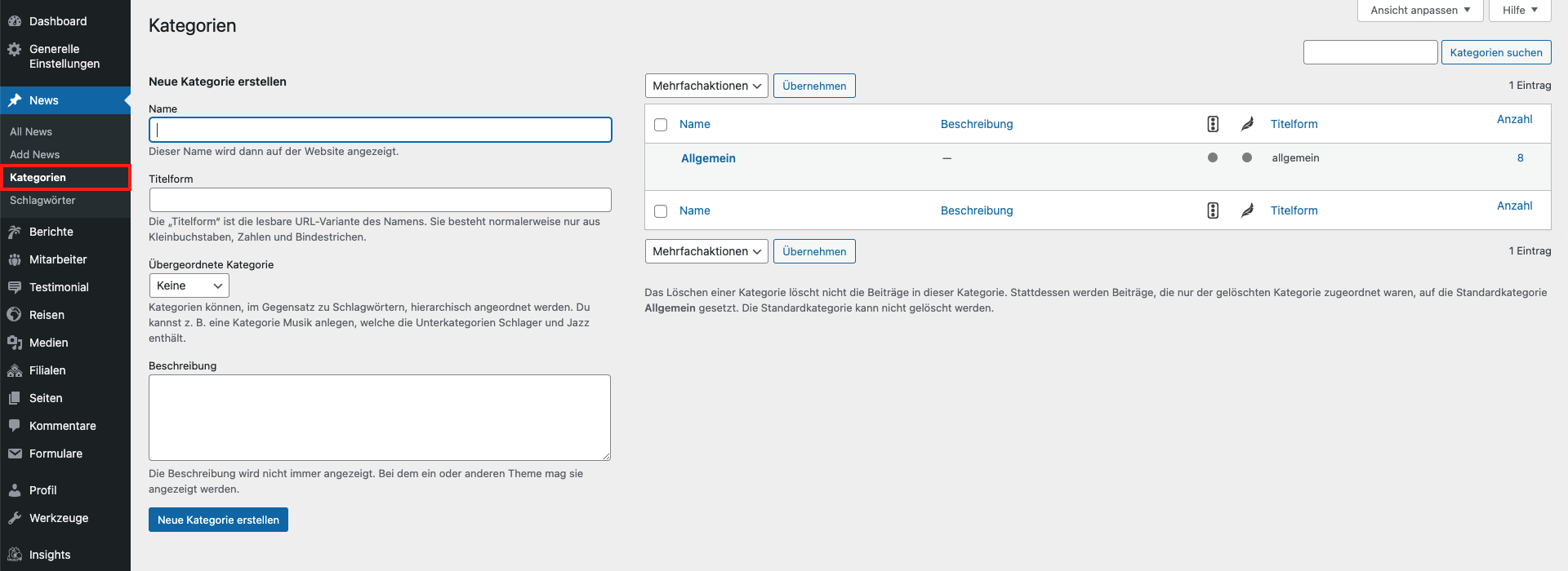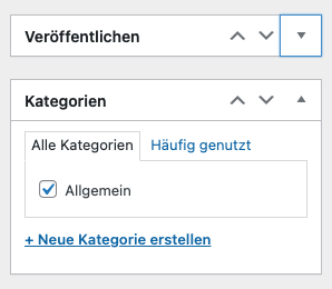 In der Sektion „Kategorien“ können Sie die Kategorien festlegen, welchen sie Ihre News unterordnen.