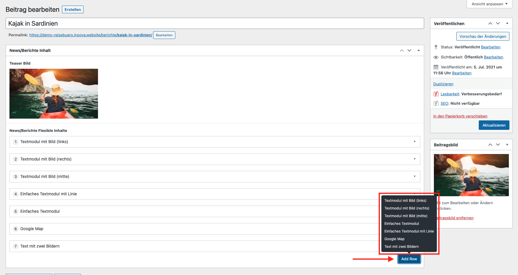 Sie können bereits erstellte Berichte bearbeiten, oder neue Berichte anlegen. Über die Aktion „Erstellen“ wird ein neuer Artikel angelegt. Sie können ein Beitragsbild definieren und die Inhalte des Beitrags frei definieren. Durch ziehen der Inhaltsmodule, können Sie die Reihenfolge anpassen. Der Button „Add Row“ zeigt ihnen die verfügbaren Inhaltsmodule, welche Sie dem Beitrag hinzufügen können.