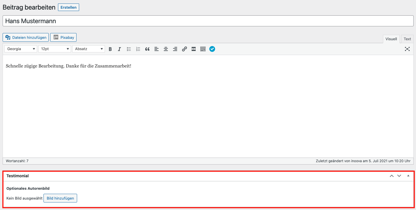 In der Sektion „Testimonials“ können Kundenerfahrungen manuell eingetragen werden, sollten diese nicht direkt von Google Reviews bezogen werden (in diesem Fall, gibt es ein extra Modul, welches einfach mit Google verknüpft wird).