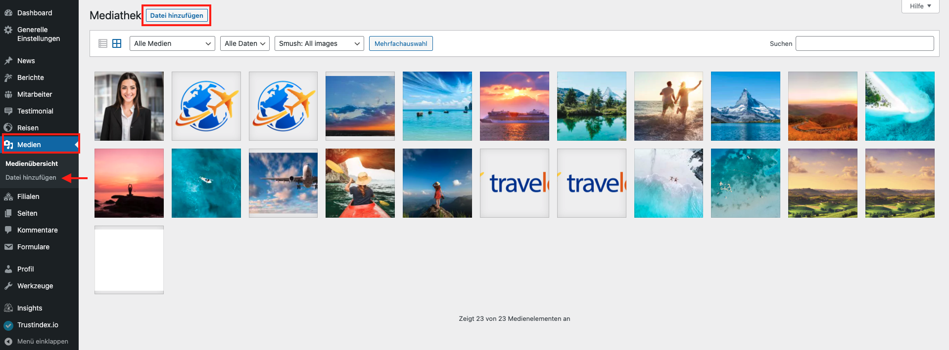 In der Sektion „Medien“ können die hochgeladenen Bilder, Videos und Audiodateien verwaltet werden. Zudem können über diese Benutzeroberfläche auch neue Medien zur Mediathek hinzugefügt werden.