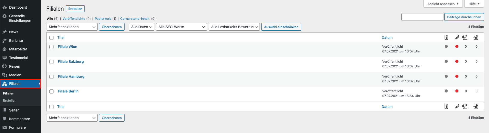 In der Sektion „Filialen“ können sie die Filialen Ihres Unternehmens anlegen (optional). Hier können bereits angelegte Filialen bearbeitet, oder neue Filialen angelegt werden