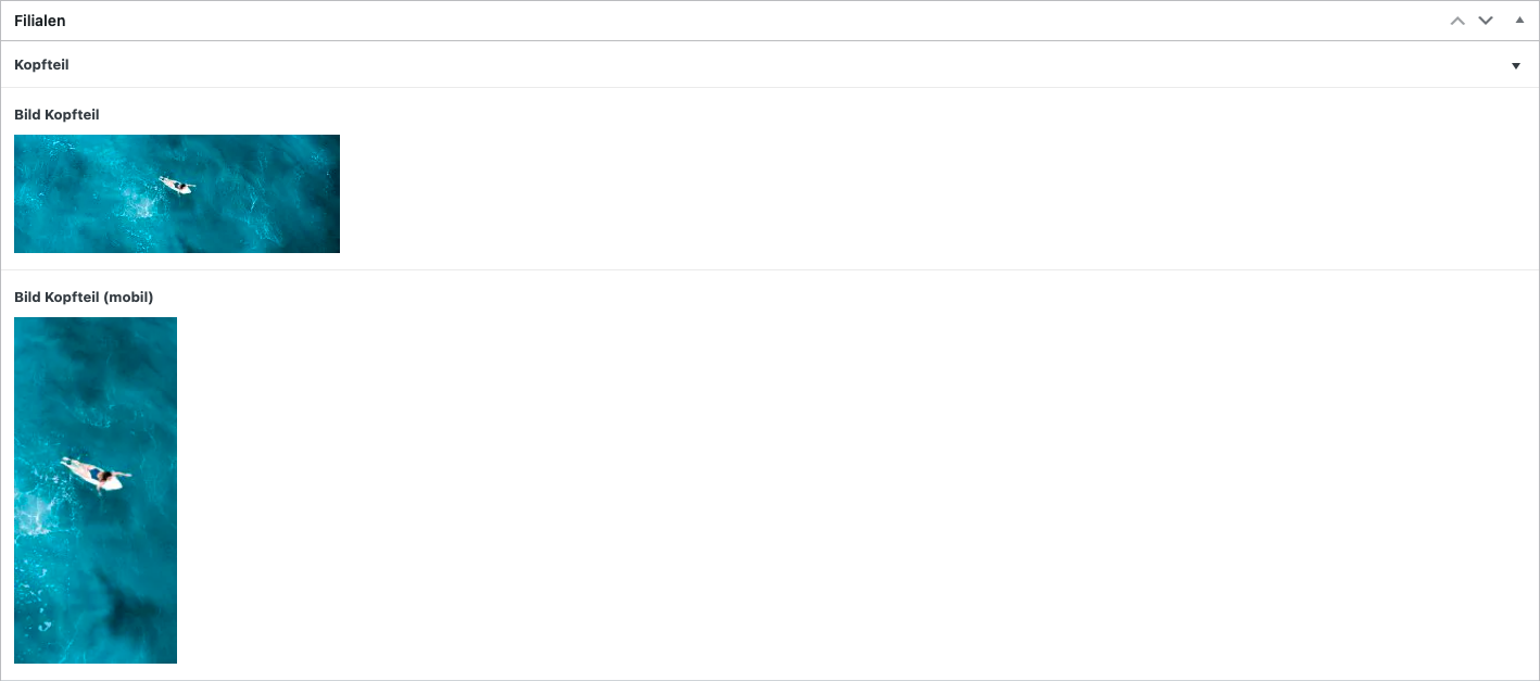 In der Sektion „Filialen“ können wir den Kopfteil bearbeiten. Hier kann ein Bild festgelegt werden.