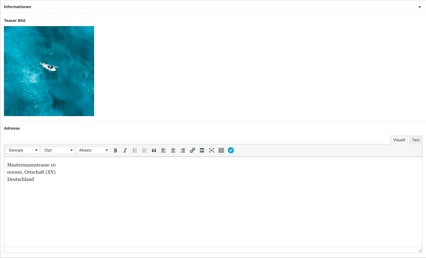 Unter „Informationen“ können ein Teaser-Bild und die Adresse des Unternehmens eingegeben werden.