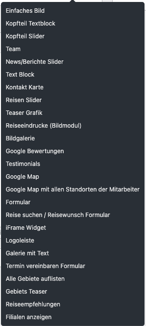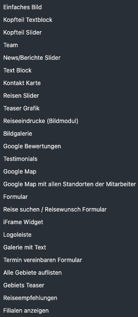 Bei den flexiblen Inhaltsmodulen kann zwischen verschiedenen Elementen ausgesucht werden. Die Funktion der einzelnen Elemente wird in der Abteilung „Module“ beschrieben