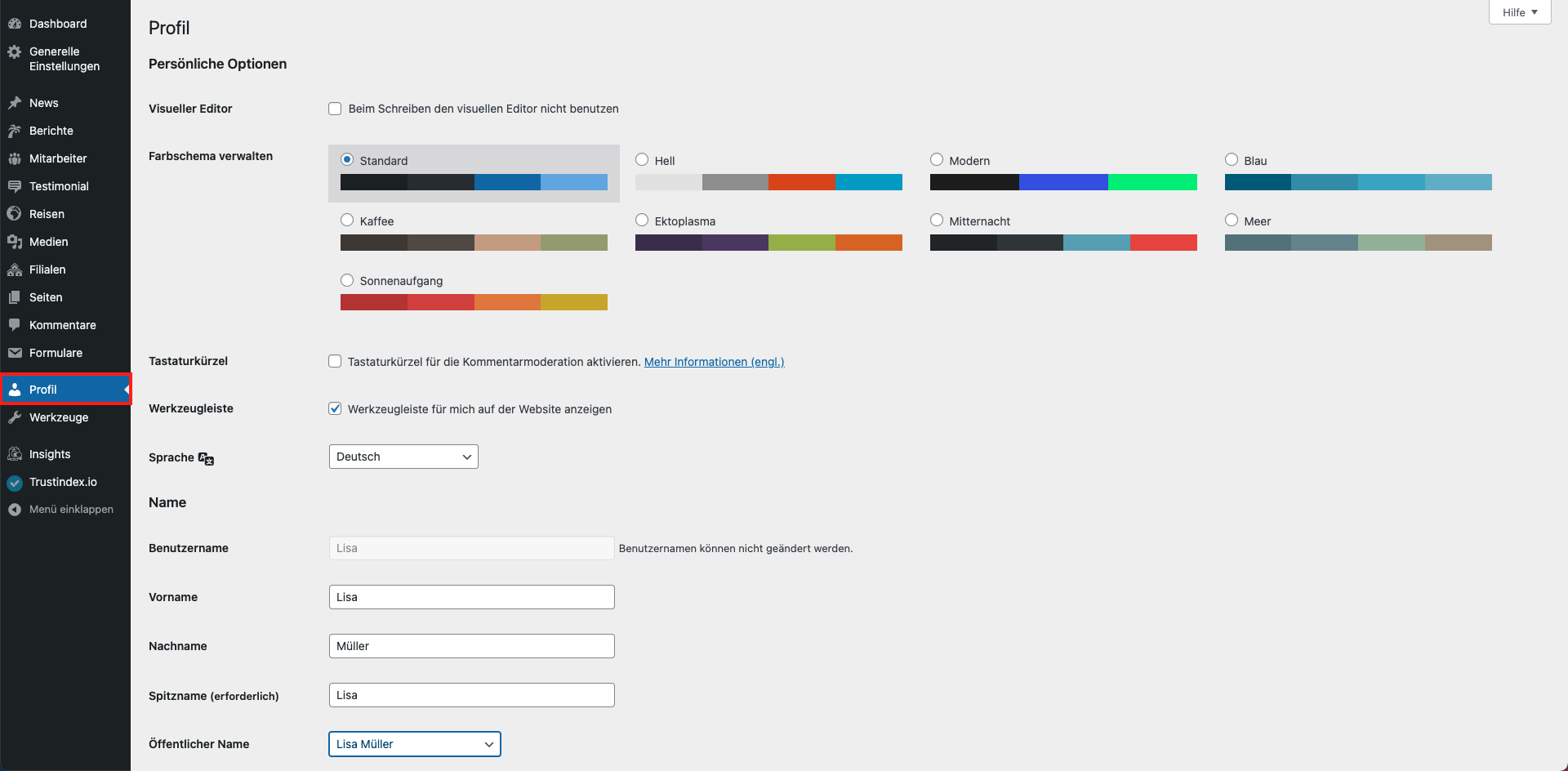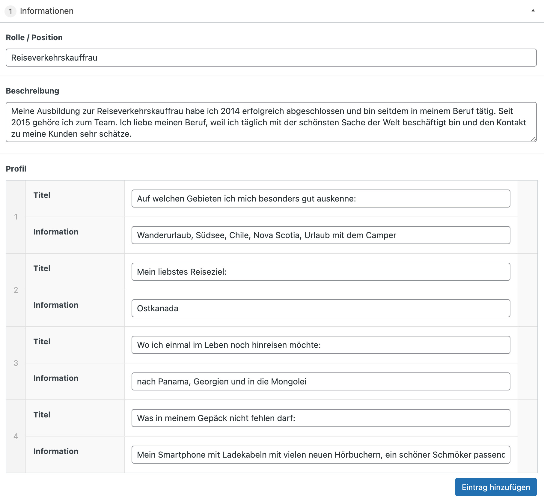 In dem Abschnitte „Informationen kann die Rolle oder Position des Mitarbeiter, sowie eine Beschreibung eingegeben werden. Unter Profil können durch „Eintrag hinzufügen“ beliebig viele Informationen eingetragen werden, wobei Titel und Information jeweils zusammengehören.