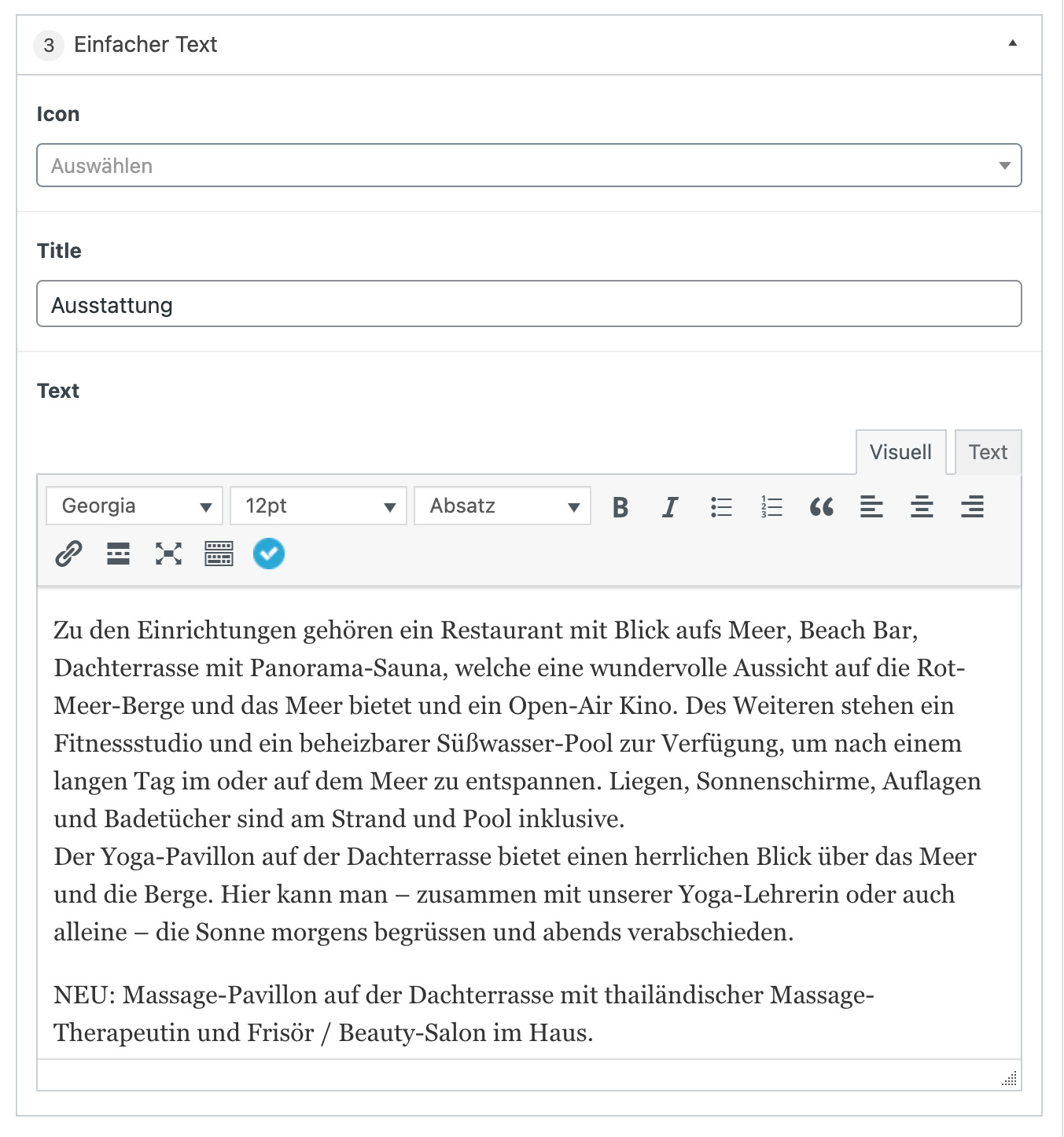 Bei diesem Modul können ein Titel, ein Text und ein zugehöriges Icon definiert werden.