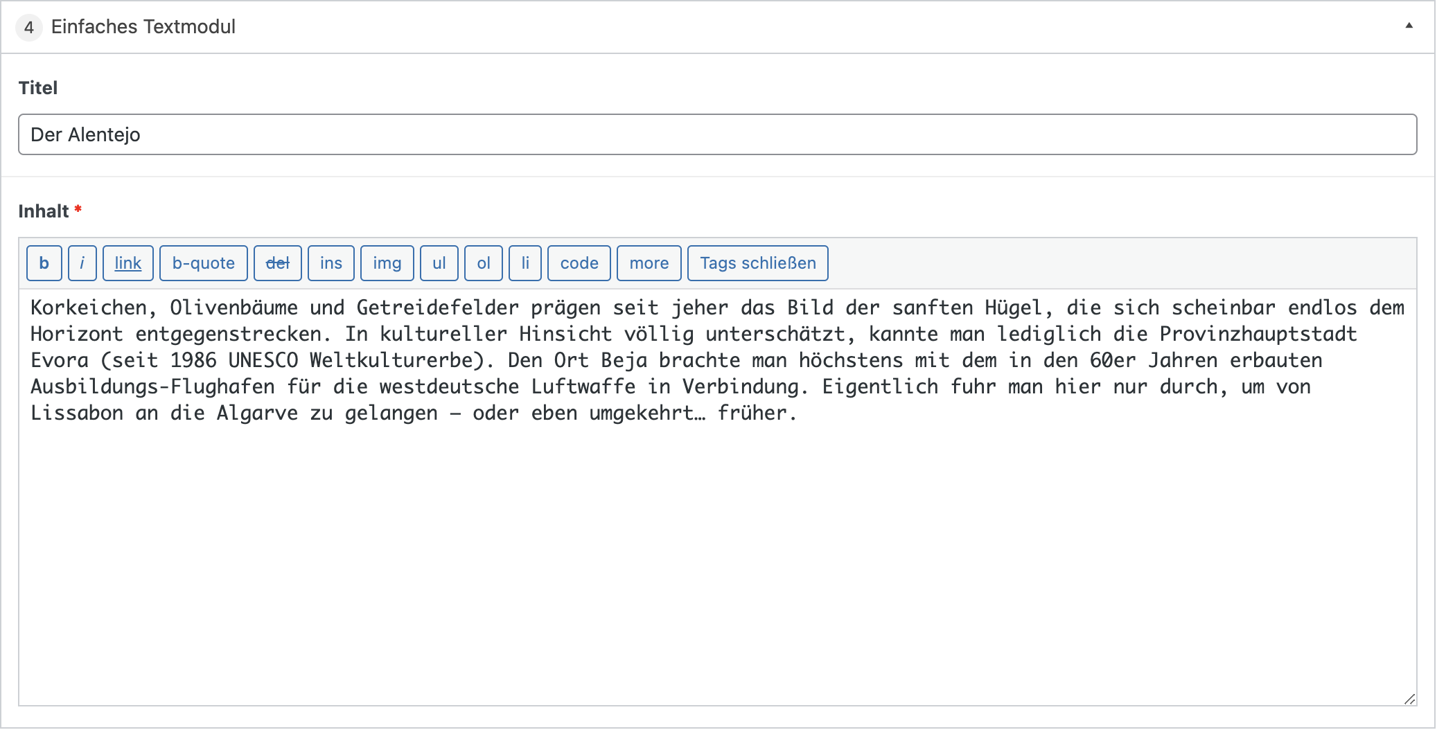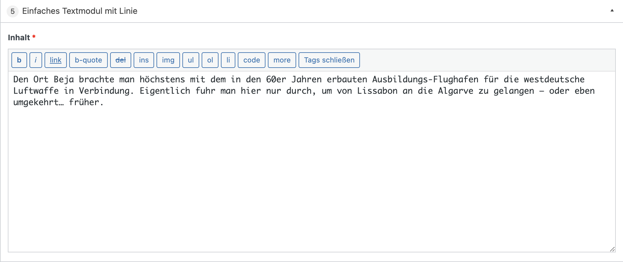Bei diesem Modul können ein Text definiert werden, welcher durch eine Linie als Zitat hervorgehoben wird.