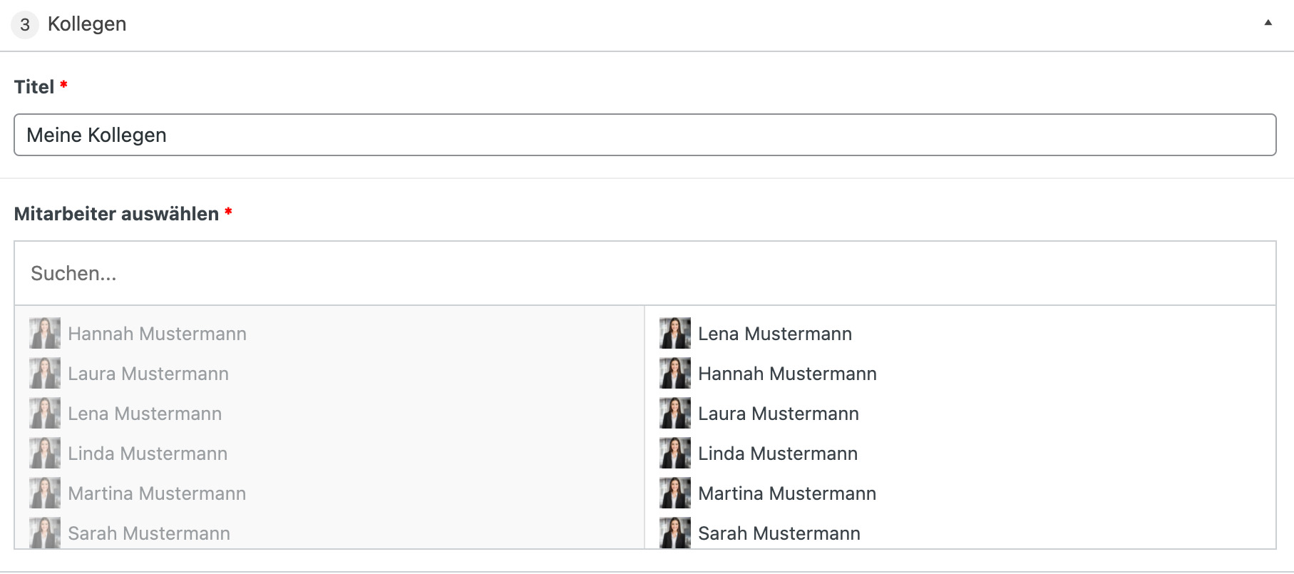 Bei diesem Modul wird ein Titel , ein Hintergrundbild und eine Auswahl an Mitarbeitern festgelegt. Die Bilder der Mitarbeiter können eckig oder rund angezeigt werden.