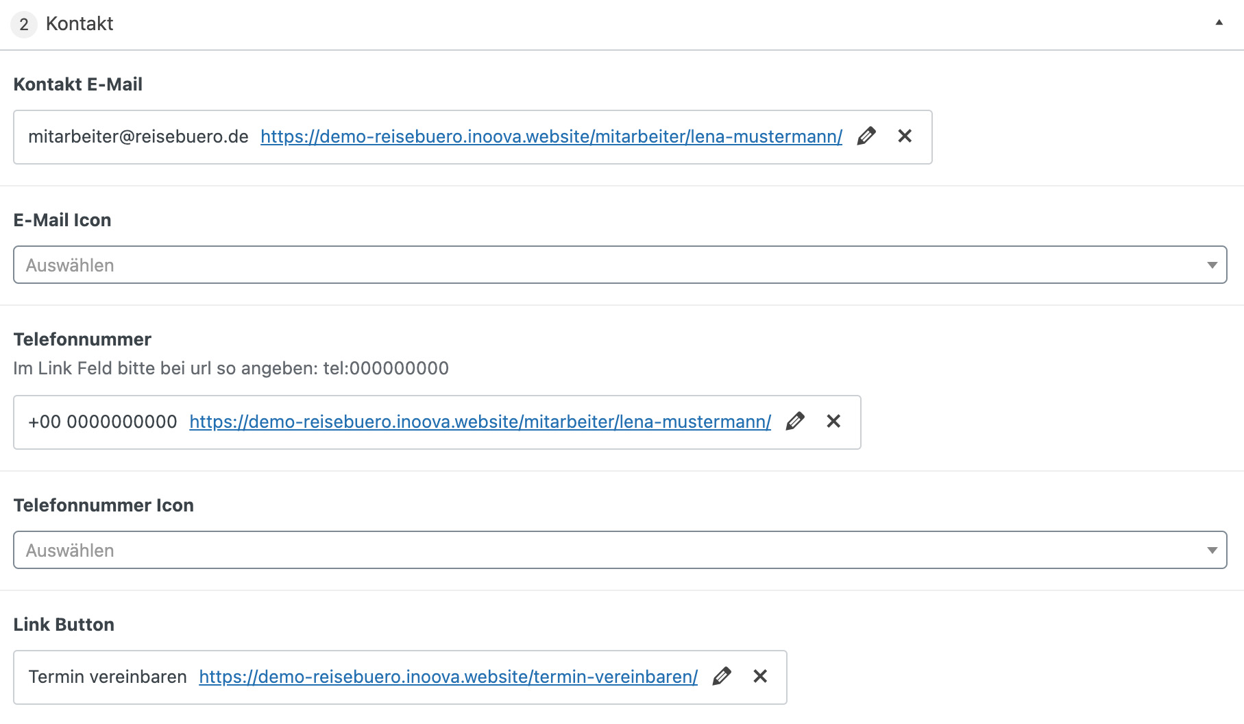 Bei diesem Modul können die E-Mail und Telefonnummer des Mitarbeiters mit jeweiligem Icon festlegen. Unter Link Button, können Sie beispielsweise auf eine Kontakt- oder Terminseite verlinken.