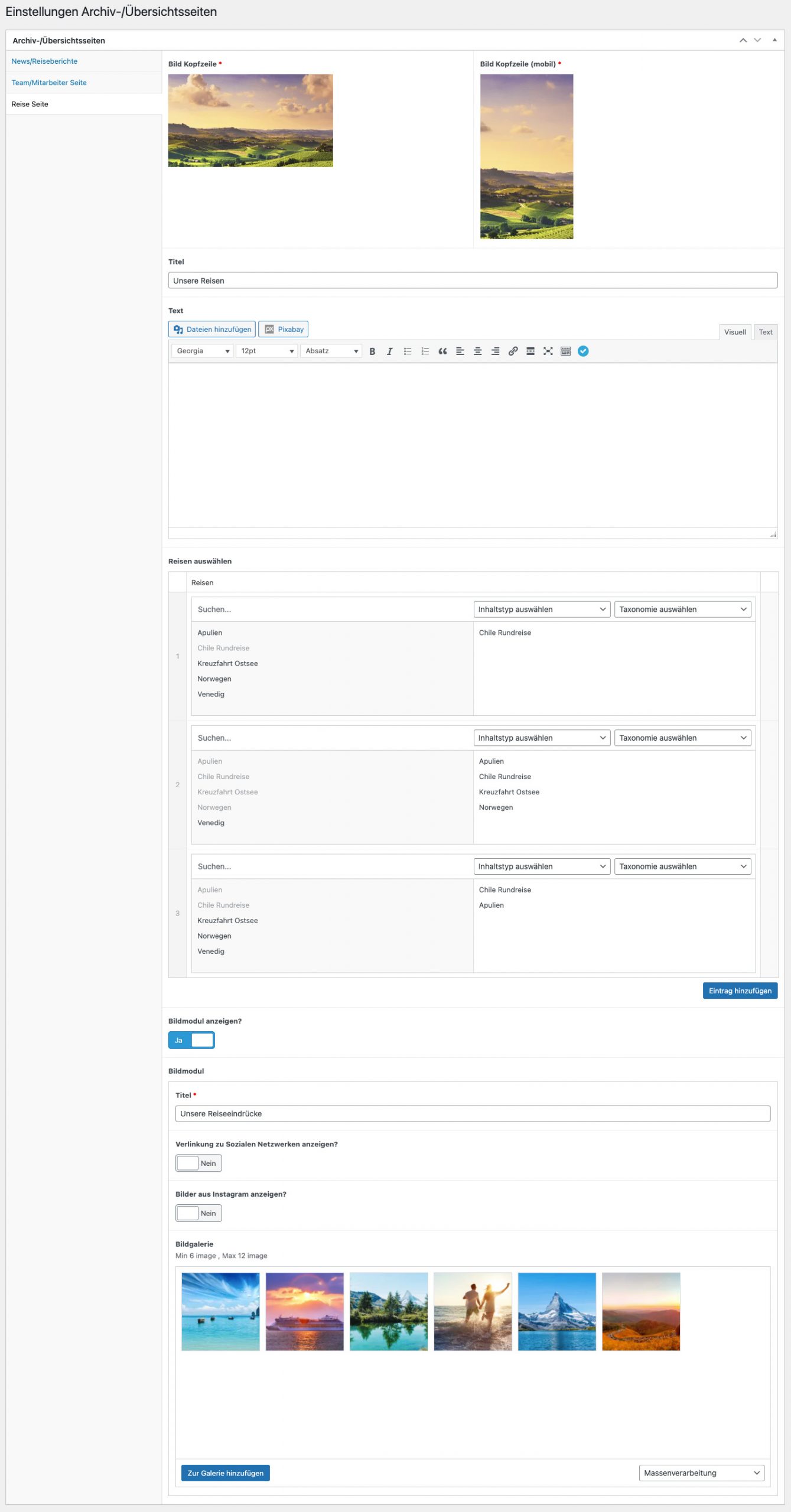 In der Sektion „Reise Seite“ muss ein Bild für die Kopfzeile festgelegt werden. In dem Bereich „Reisen auswählen“ können mehrere Module angelegt werden, wobei sich die Anordnung der Reisen je nach Anzahl der Reisen eines Moduls anpasst.