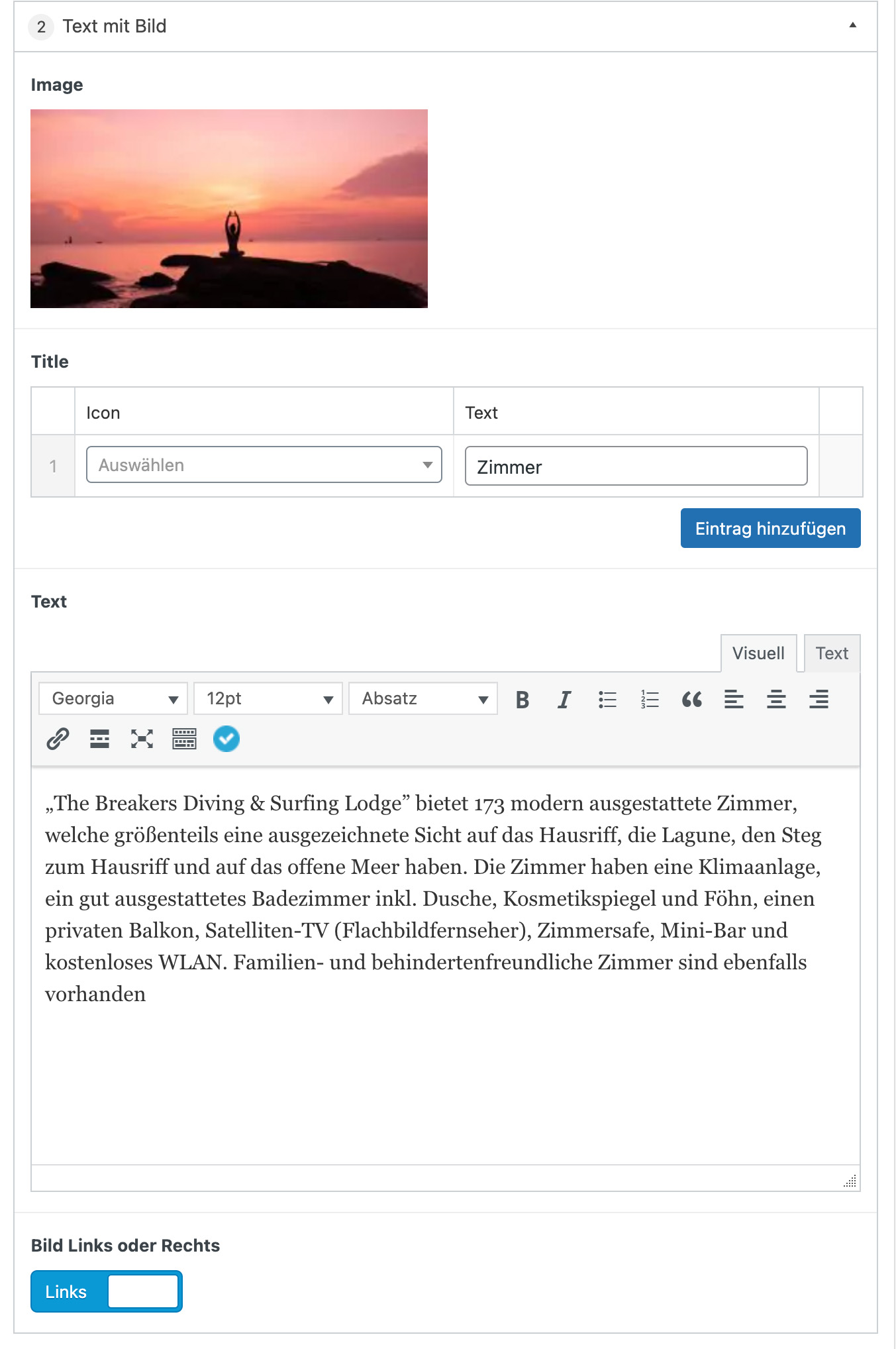 Bei diesem Modul können ein Bild, ein Titel mit zugehörigem Icon und ein Text eingegeben werden. Zudem können wir festlegen, ob das Bild links oder rechts vom Text angezeigt werden soll.