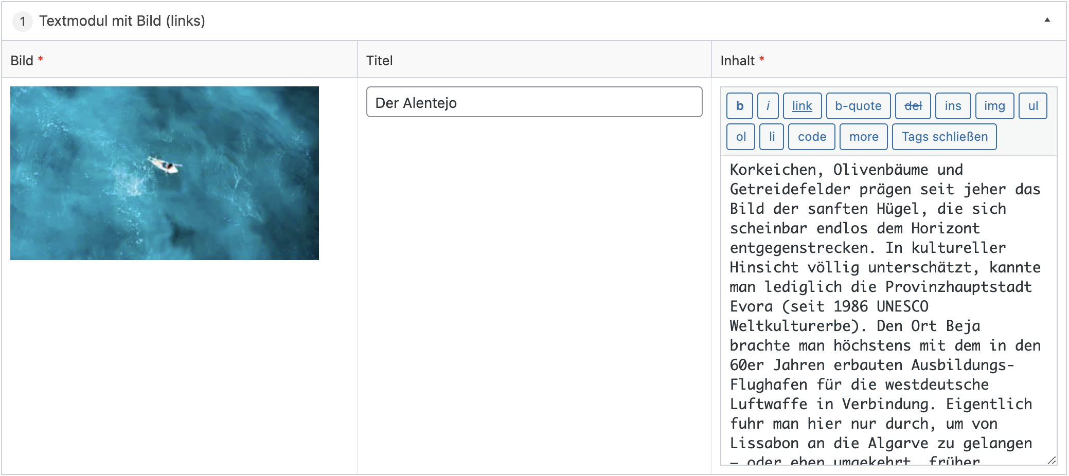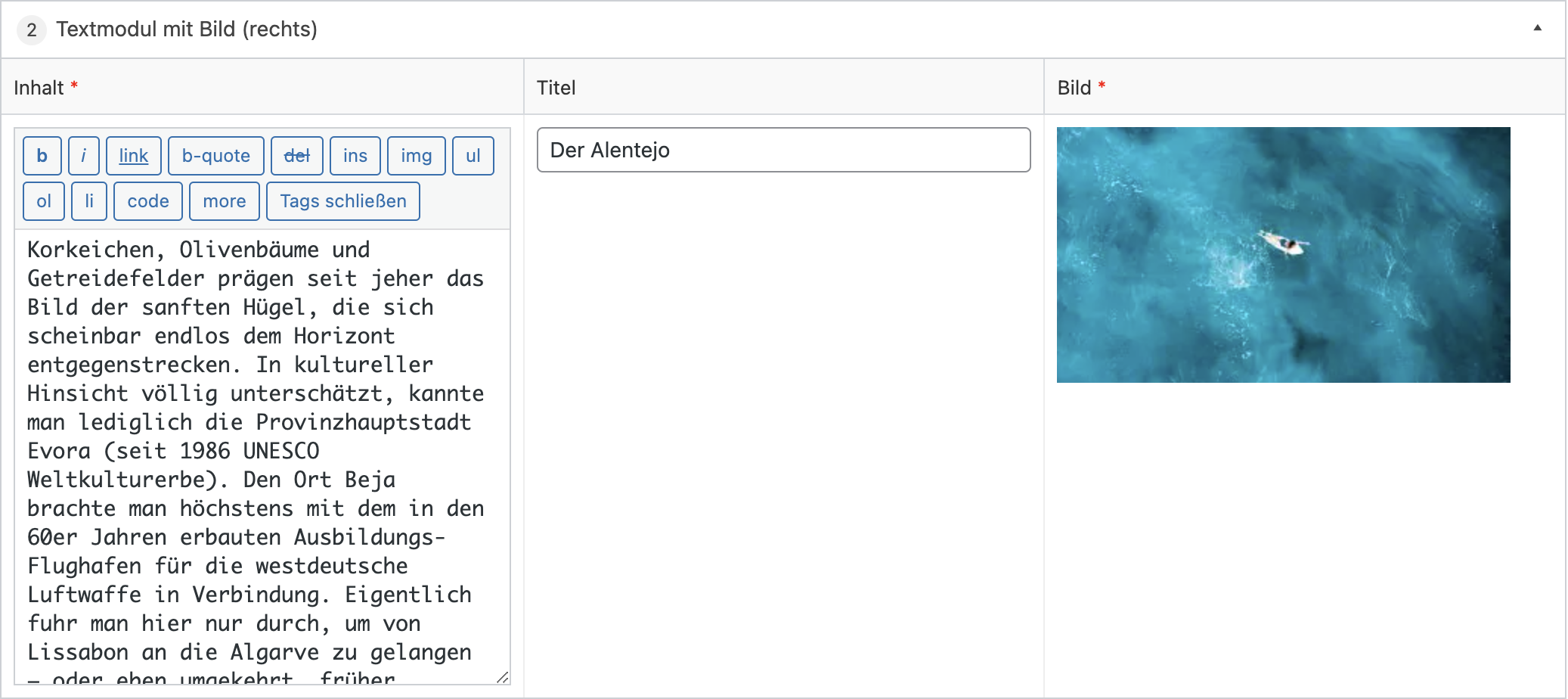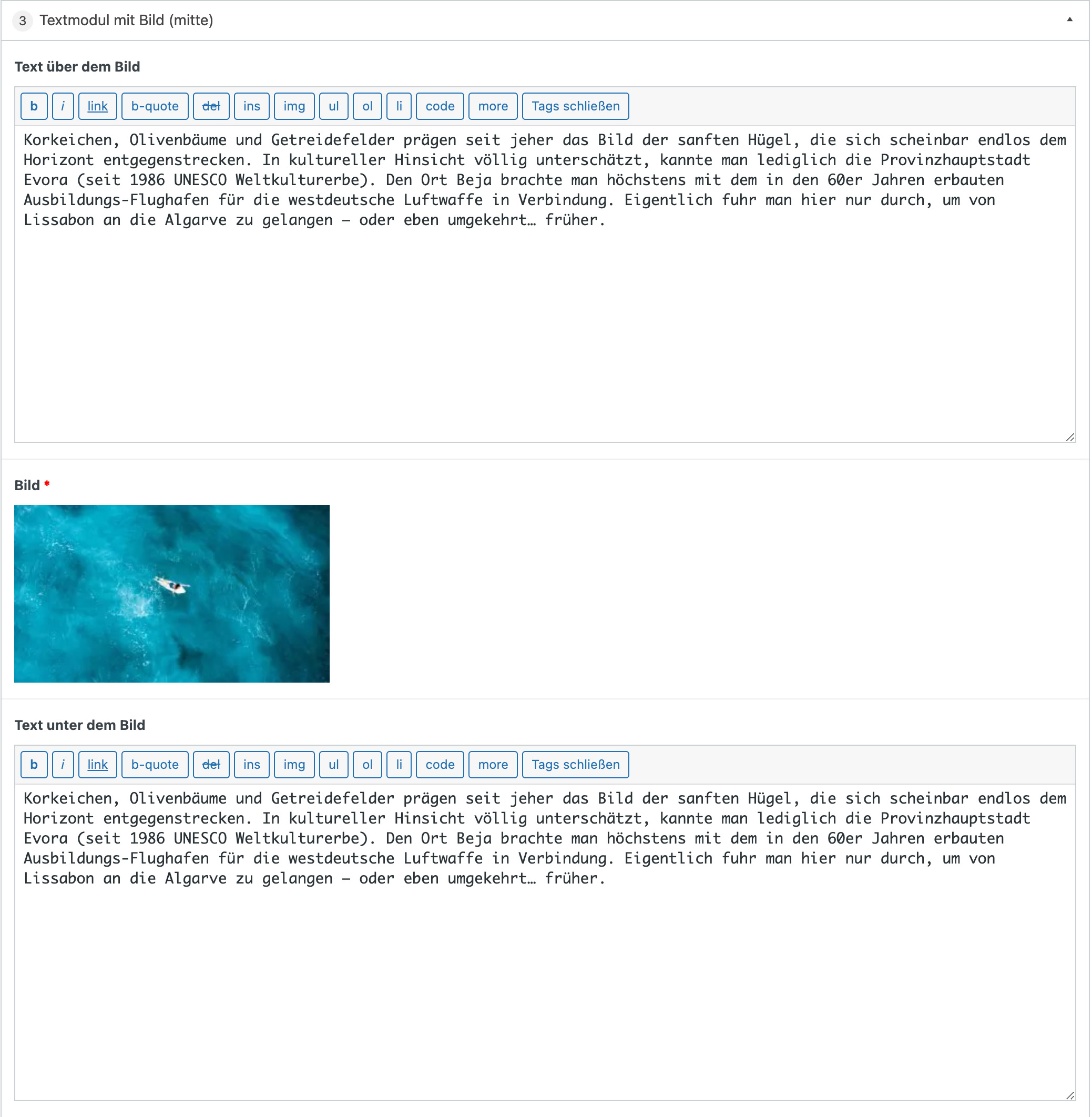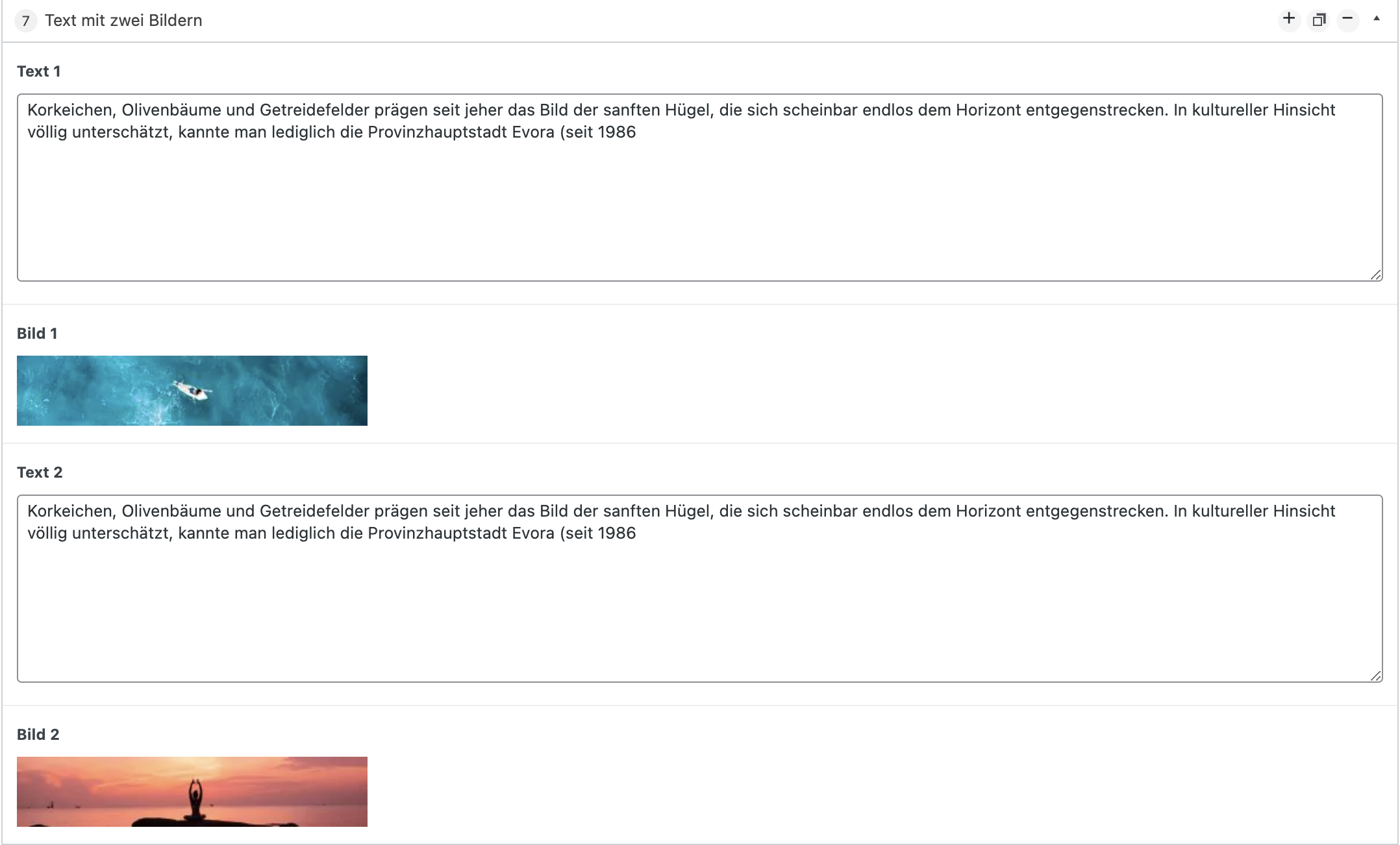 Bei diesem Modul können zwei Bilder mit zugehörigen Textabschnitten eingegeben werden.